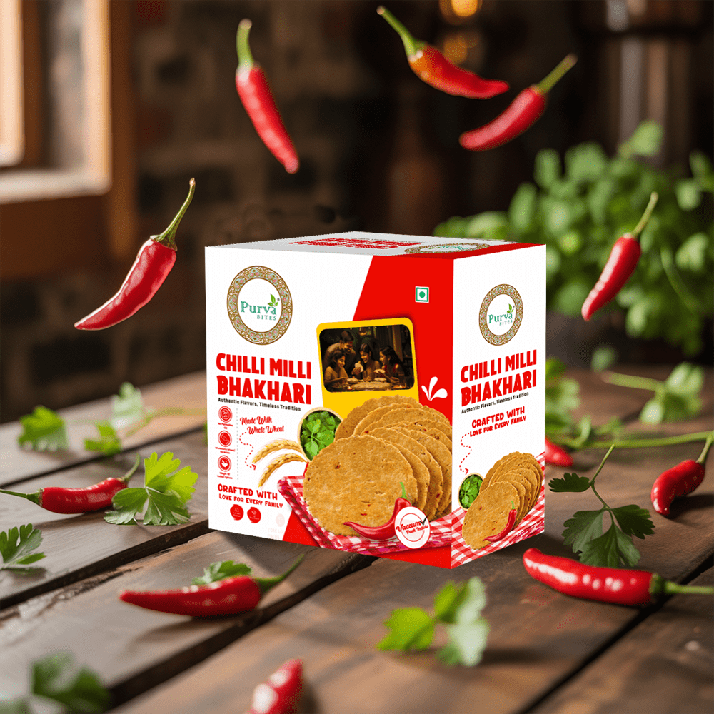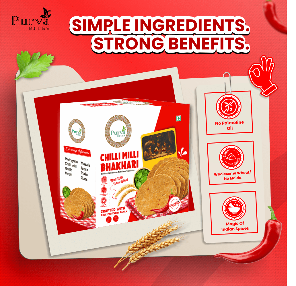 Want to add some spice to your snacking routine? Our Chilli Milli Bhakhri is the perfect choice! Made with premium quality whole wheat flour and infused with a fiery blend of spices, these crispy discs offer a unique and satisfying snacking experience that’s sure to awaken your taste buds. The bold and spicy flavor of chilli makes these snacks a perfect accompaniment to your meals or a standalone snack that’s perfect for any time of day. Whether you’re looking for a quick snack on-the-go or a flavorful addition to your meals, our Chilli Bhakhri is the perfect choice for those who love a bit of heat.